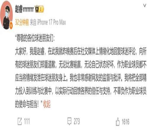 赵睿就“情绪化回复球迷谈论”致歉:无论角逐输赢都不应当将情绪发泄在球迷朋侪身上