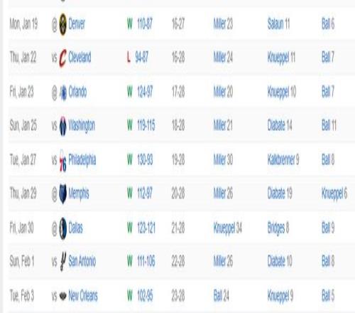 这一波七连胜中黄蜂全队有6人场均得分都上双:米勒23.1分、鲍尔17.9分,克努佩尔16.4分、布里奇斯14.3分、塞克斯顿11.1分、迪亚巴特10.7分 。