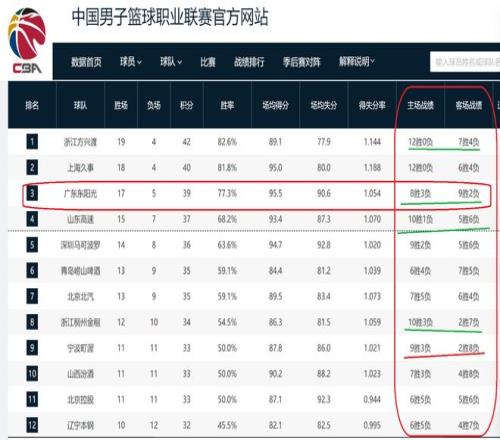 是什么数据呢?那就是本赛季,开赛至今,CBA20支球队,只有广东队的主场效果不如客场效果!你没有听错,广东队是CBA联赛唯逐一支客场效果比主场效果好的球队。