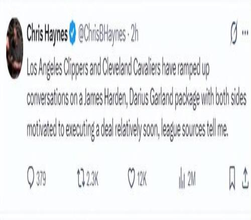 凭证NBA记者克里斯-海恩斯的报道 ,快船、骑士两队的相同正在加速 ,哈登换加兰的谈判有条不紊的举行 ,双方都希望能促成这笔生意。