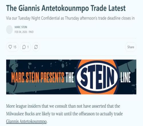 Substack名记Marc Stein也曝出紫金军团简直在起劲谋划,妄想在2026年选秀夜之后使用三个可生意的首轮签(2026年、2031年和2033年)与签换权成为字母哥的主要追求者 。