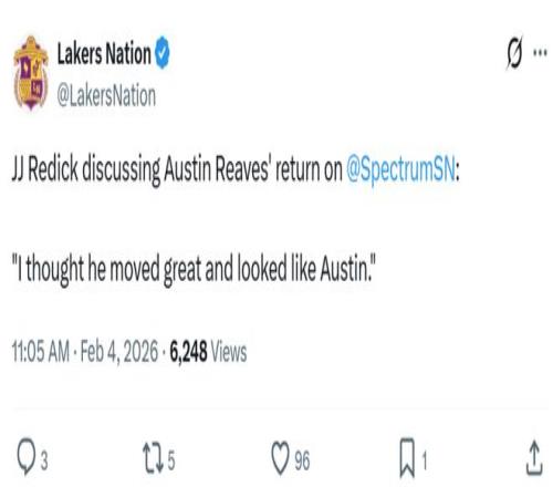 虽然还没有完全找到角逐节奏,但关于攻防系统较为懦弱的湖人来说,能够迎回里夫斯已经是重大的利好,赛后雷迪克赞美到:“他的移动很棒,看起来很像他自己 。”