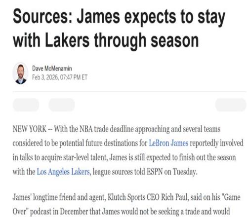 新闻来自于ESPN名记Dave McMenamin,他体现数支传言是詹姆斯下家的球队正在举行引进球星的谈判,但詹姆斯预计将在湖人打完本赛季剩余角逐 。