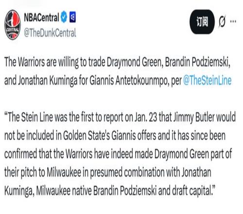 Stein体现:“1月23日我们已率先报道,吉米-巴特勒不会被纳入勇士队追逐字母哥的生意报价中。以后新闻获得证实,勇士队为说服雄鹿生意,已明确将德雷蒙德-格林纳入生意计划,这份报价或许率还包括乔纳森-库明加、土生土长的威斯康星州密尔沃基人波杰姆斯基,以及若干选秀资产。”