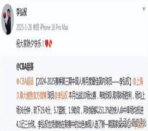 2025年1月,李弘权依附12月的月度最佳体现,代表上海出战10场角逐,取得8胜2负的战绩,场均上场36分钟,砍下19.4分、5.7篮板、1.9助攻,同时能够以51.3%的惊人掷中率场均投进4.1记三分球 。李弘权也依附他在联赛中的精彩体现入选了新一期国家集训队 。