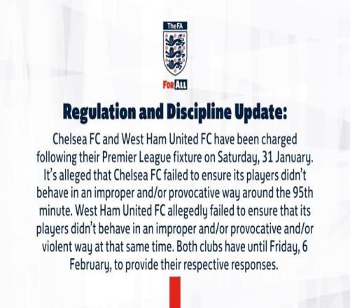 切尔西和西汉姆联由于1月31日的英超角逐被指控,据称,切尔西未能确保其球员在第95分钟时没有不当和/或寻衅行为,而西汉姆联被指控未能确保其球员在统一时间没有不当、寻衅和/或暴力行为,两家俱乐部需在2月6日之条件交各自的回应。(通告完)