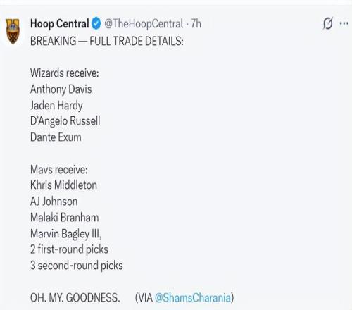北京时间2月5日 ,奇才、独行侠告竣了大生意 ,独行侠送出安东尼-戴维斯、杰登-哈迪、丹吉洛-拉塞尔、丹特-艾克萨姆;奇才送出克里斯-米德尔顿、AJ-约翰逊、马拉基-布兰纳姆、马文-巴格利三世、2个首轮签、3个次轮签 。