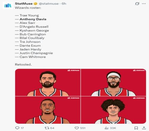 这笔生意后 ,凭证ESPN的新闻 ,本赛季被奇才生意获得的全明星球员特雷杨、安东尼-戴维斯都不会再这个赛季代表奇才队出战 ,球队内部志在输掉更多角逐攻击更高的顺位 ,AD与特雷杨也可以使用今年来将伤病所有治愈 。