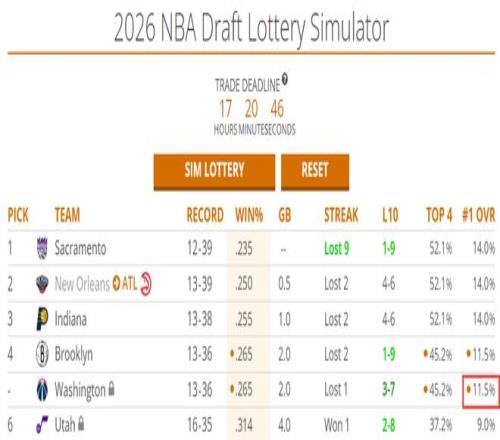 现在奇才13胜36负 ,状元签概率11.5% ,前四顺位概率45.2% ,现实上奇才与国王、鹈鹕、步行者胜场只差2-1.5个 ,奇才队说未必有希望继续摆烂到最差 ,奇才队可以攻击一下状元签 。