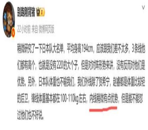 日前 ,日本篮协宣布了世预赛的集训名单 ,对此媒体人别跑刚背猪发文体现:“日本平均身高1米94 ,和中国男篮差不太多 ,但中国男篮有内线优势。”