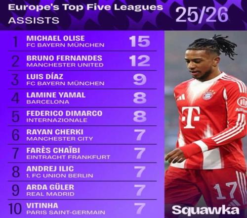 B费本赛季至今在联赛中已孝顺12次助攻,排名欧洲五大联赛第2位,仅次于拜仁的奥利塞。