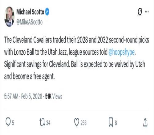 重复饱受伤病困扰的鲍尔,本赛季体现下滑严重,骑士队不得不打包两枚次轮签将他价值1000万美元的条约送出去,爵士官方也迅速将其裁掉。