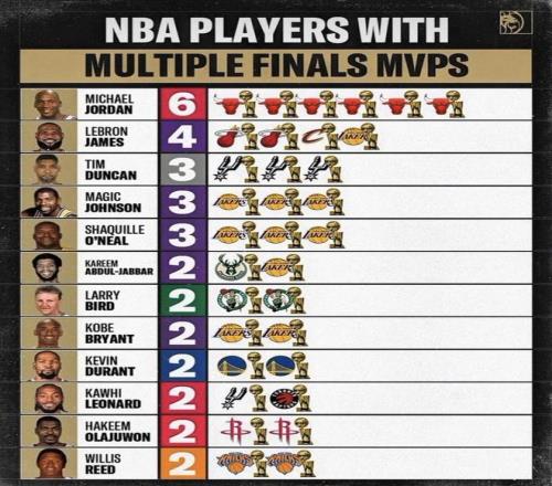 这份榜单只认一个工具:总决赛MVP次数。按这个标准 ,杜兰特的两次都带着硬数据支持。