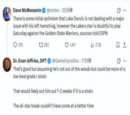 其时 ,医学专家Jeffries剖析东契奇潜在的腿筋伤势:担心泛起肌肉拉伤情形 ,归期需视伤势水平而定 ,若是只是肌肉紧绷 ,那是逐日视察 ;若是是一级拉伤 ,要休战1-2 周 ;若是是二级拉伤 ,要休战4-6周 。
