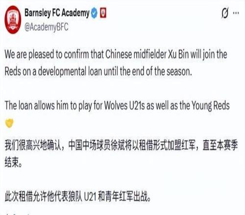 2月16日晚上,狼队官方宣布,徐彬租借加盟巴恩斯利,至本赛季竣事。同时,仍保存徐彬代表狼队U21加入角逐的资格。