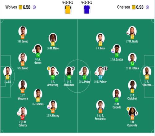 切尔西首发:1-桑切斯、27-古斯托(75’34-乔什·阿昌庞)、29-福法纳、23-查洛巴、3-库库雷利亚、17-桑托斯(84’21-哈托)、25-凯塞多、8-恩佐、10-帕尔默(61’49-加纳乔)、7-内托、20-佩德罗(75’9-德拉普)。