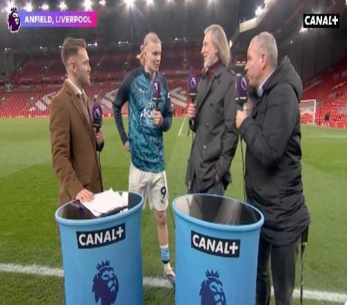英超第25轮 ,曼城客场2-1战胜利物浦 ,曼城先锋哈兰德赛后接受了CANAL+体育的采访。
