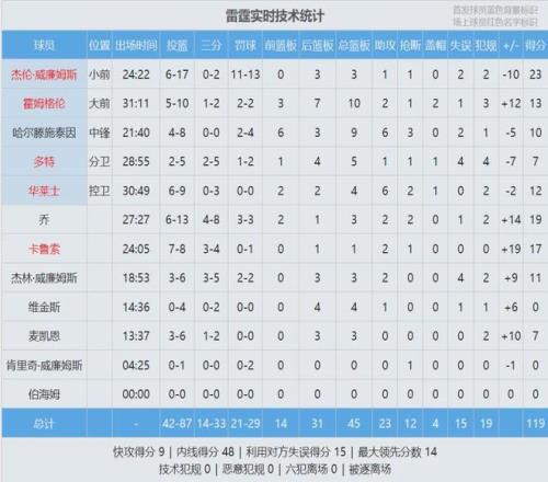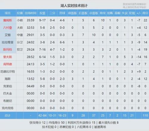 È«³¡¿¢Ê£¬ºþÈË110-119²»µÐÀ×öª£¬Ã÷ÌìºþÈ˱³¿¿±³¶ÔÕóÎ÷²¿µÚ¶þµÄÂí´Ì¡£Àï·ò˹Ê×½Ú4ÖÐ4£¬ºóÈý½Ú8ÖÐ2£¬È«³¡14ÖÐ6¿³ÏÂ16·Ö2Àº°å7Öú¹¥5ʧÎó¡£Õ²Ä·Ë¹17ÖÐ9£¬»ñµÃ22·Ö6Àº°å10Öú¹¥3ʧÎó¡£½ÜÍþ»ñµÃ23·Ö£¬ÒÔÈüÑÇ-ÇÇ¿³ÏÂ19·Ö¡£
