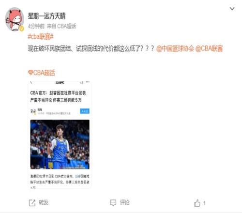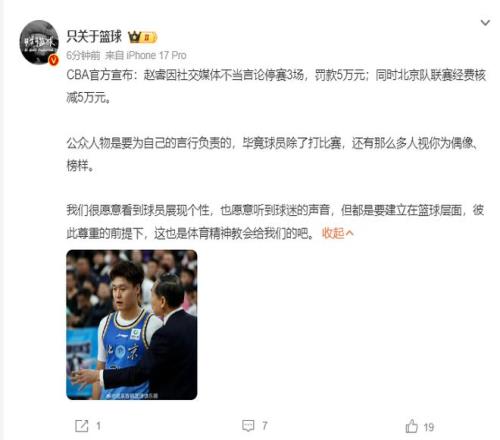 ±±¾©Ê±¼ä2ÔÂ11ÈÕÍí£¬CBA¹«Ë¾¹Ù·½Ðû²¼¶Ô±±¾©ÄÐÀºÇòÔ±ÕÔÙÐд¦·Ö£¬ÕÔî£ÓÉÓÚÔÚÉ罻ýÌåÐû²¼ÑÏÖØ²»µ±ÑÔÂÛ±»´¦ÒÔÍ£ÈüÈý³¡¡¢·£¿î5ÍòÔª¡£