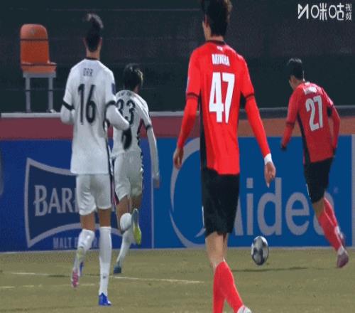 第13分钟,江原右路还击,朴相赫横传禁区被挡,徐珉优12码位置得球爆射横跨。