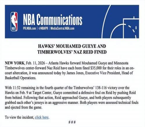 ±±¾©Ê±¼ä2ÔÂ12ÈÕ£¬NBA½ñÈÕ¹Ù·½Ðû²¼£¬¶ÔÉ­ÁÖÀÇÄÚÏßÄÉ×È-ÀïµÂÓëÀÏÓ¥ÏÈ·æÄº±Ä¬µÂ-¸ÇÒ®¸÷´¦ÒÔ35,000ÃÀÔª· £¿î£¬Ôµ¹ÊÔ­ÓÉÊÇÁ½ÈËÔÚÖܶþÀÏÓ¥Ö÷³¡µÄ½ÇÖðÖб¬·¢³¡ÉϳåÍ»¡£