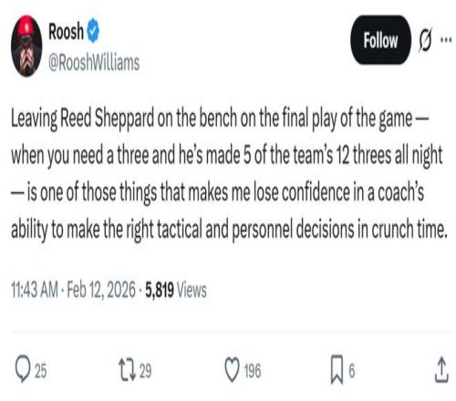RooshWilliams写道:“当球队要害时刻落伍3分时,乌度卡将整晚掷中了全队12记三分球中5个的谢泼德摁在板凳席,这种决议让我对教练在要害时刻做出准确战术和职员调解的能力失去了信心 。”