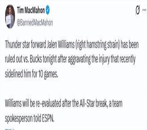 雷霆又遭攻击!杰伦威廉姆斯再次拉伤右腿筋全明星周末后复查