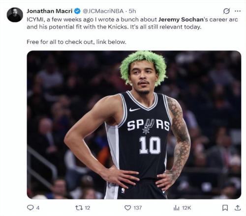 尼克斯队记乔纳森-麦克瑞写道:几周前我就撰写过杰里米-索汉的生涯生长轨迹与他跟尼克斯契合度的文章 ,现在这些内容依旧有参考价值 ,他简直很适合我们。