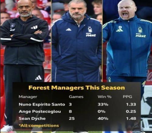 只要看看本赛季诺丁汉森林这三位前任主帅的战绩,努诺执教3场,胜率33%,场均积1.33分,离队缘故原由与老板关系破碎;波斯特科格鲁执教8场,战绩更是无法直视的2平6负胜率0%,场均积0.25分;肖恩戴奇执教25场,胜率40%,场均积1.48分,戴奇着实是这三人中效果最好的谁人。 他40%的胜率甚至凌驾了一经带队进欧战的努诺(38.36%)。若是只盘算戴奇上任后的积分,森林甚至能排在积分榜中游。但他照旧下课了。