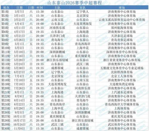 2月14日晚,2026赛季中超联赛赛程正式宣布,联赛将于3月6日开幕,揭幕战放在了成都凤凰山体育公园,由成都蓉城对阵深圳新鹏城 。山东泰山新赛季上半程占有适当的主场优势,其中3月14日主场对国安、4月17日主场对海港、5月5日主场对申花,若是这三场角逐打好,将涤讪整个赛季的基调 。
