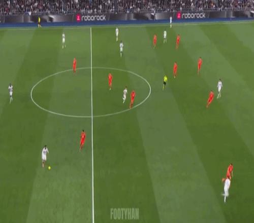 不需要繁杂的洗球、穿插、跑动 ,阿诺德这一脚长传 ,就能直接找到维尼修斯 ,形成绝佳的还击时机(如下动图)。