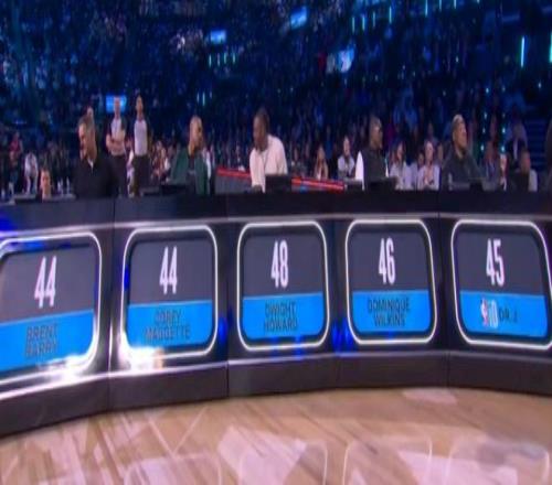 第四位登场的是湖人中锋海斯,他从后场启动后从三分线最先助跑,在罚球线以里完成一次质朴无华的暴扣,仅获得44.6分。
