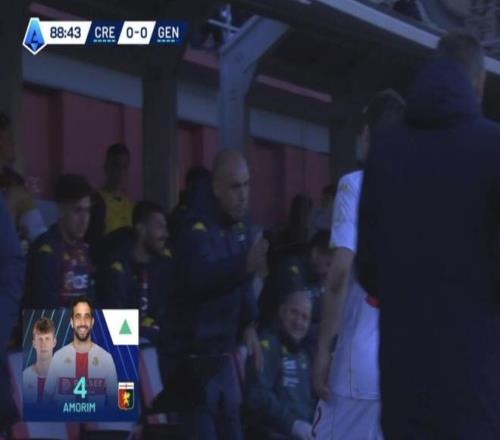 角逐末段,热那亚主帅德罗西让替补席上的亚历山德罗-阿莫林起身,准备换下弗伦德鲁普。转播图像显示了两人的名字与照片:弗伦德鲁普配的是自己照片,但阿莫林那一栏却“画风差池”——头像并非年轻的热那亚中场亚历山德罗-阿莫林,而是前曼联主帅鲁本-阿莫林,他不久前刚被曼联开除。