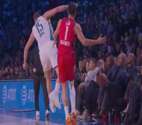 前美国总统奥巴马也现身角逐现场观战,并且在角逐中,约基奇和布克争抢球权时把球传给了奥巴马。