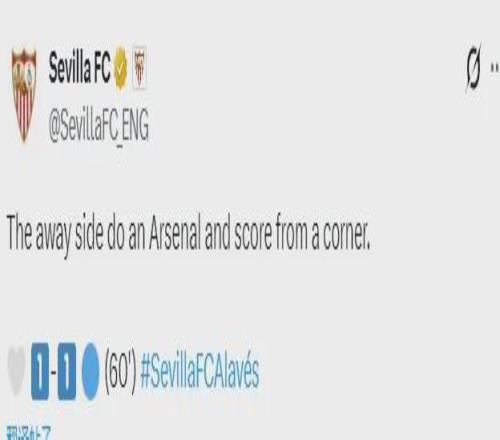 塞维利亚官推在更新角逐比分时揶揄了一把阿森纳,他们写道:“客队(阿拉维斯)像阿森纳那样,打进了一粒角球。”
