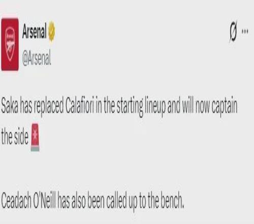 阿森纳官推确认,萨卡取代卡拉菲奥里进入了首发阵容,并且担当队长,小将奥尼尔进入了替补席。