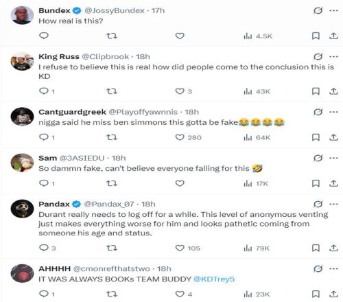 谈论区的球迷们对这些言论大都是存疑的 ,但也有一些人以为这像是杜兰特的作风 ,希望杜兰特自己回应来辟谣 。
