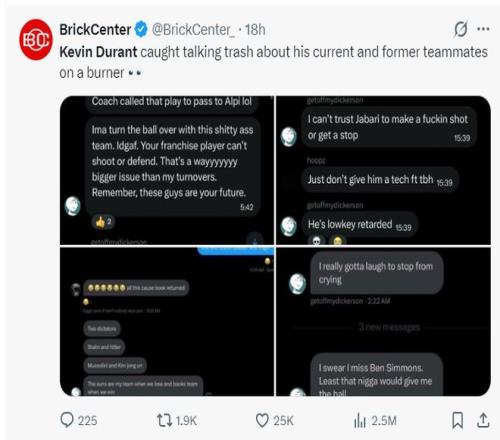 美媒BrickCenter也爆料了疑似杜兰特小号的事务 ,由于这个账号在社媒上种种炮轰杜兰特的前队友、现队友 。