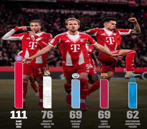 本赛季至今,哈里-凯恩、奥利塞以及路易斯-迪亚斯合计直接加入的进球数已经高达111球,同期这一数据位列全欧第一,比排名第二的皇马三叉戟姆巴佩、维尼修斯和居莱尔多出了35球。