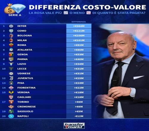 北京时间2月17日  ,德转统计出了意甲20支球队构建阵容的本钱与现有价值的差价排行榜  ,国际米兰以增添3.64亿欧元高居第一  ,那不勒斯则是唯一负增添的球队  ,排名垫底。
