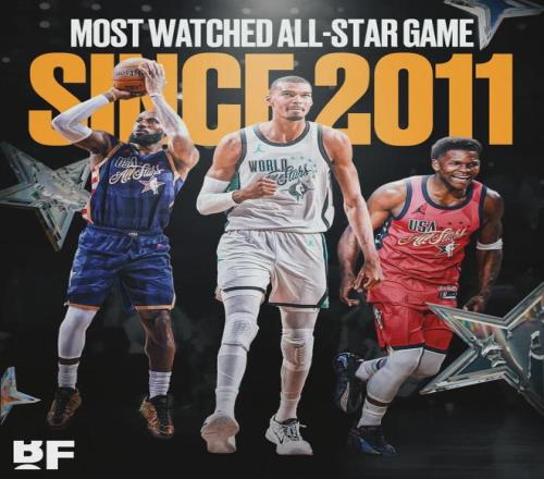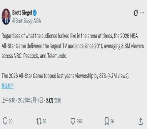 北京时间2月17日,据NBA记者Brett Siegel报道,2026年NBA全明星正赛收视人数宣布:在NBC、Peacock和Telemundo三大平台平均观众人数抵达880万,创下自2011年以来,近15年全明星正赛的最高收视纪录,比2025年(470万)暴涨了87%。