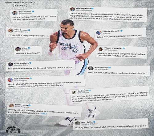 文班亚马说:“全明星是我打心底里重视的角逐,全力以赴争胜就是我最基本的态度。”记者问他是否有能力成为NBA门面?文班回覆:“NBA和社交媒体可以推广他们想推广的人,但归根结底是要看球员的能力,以及球迷更喜欢谁!”