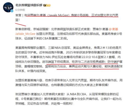 刚刚 ,北京队宣布了一则主要新闻 ,没错 ,那就是球队正式签约NBA总冠军球员贾维尔·麦基 ,接下来 ,贾维尔·麦基将会代表北京队加入CBA第二阶段的角逐 ,同时 ,他将会穿北京队0号球衣。