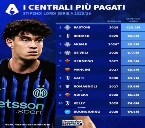 本赛季意甲中卫年薪榜:巴斯托尼1020万欧第1,布雷默930万第2