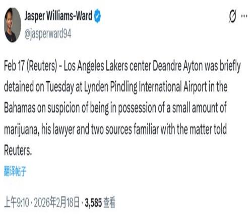 北京时间2月18日,据其状师及两名知情人士向路透社证实,洛杉矶湖人中锋德安德烈-艾顿于今日在巴哈马林登-平德林国际机场因涉嫌携带少量大麻被短暂扣留。
