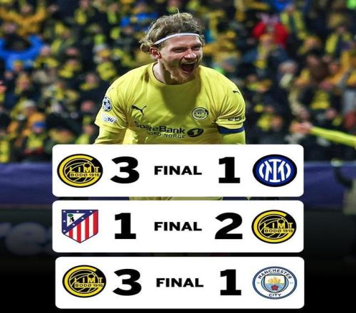 这支挪威劲旅最近太猛了 ,接连击败曼城、马竞、国米 ,豪取欧冠三连胜 ,成为首支取得欧冠三连胜的挪威球队 ,上演本赛季欧冠黑马狂飙!