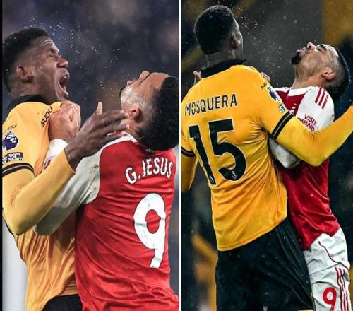 在这场跌荡升沉的英超平手赛后狼队与阿森纳的球员爆发了冲突,热苏斯原来倒地不起,听到终场哨响后跳起来和敌手爆发肢体冲突 。
