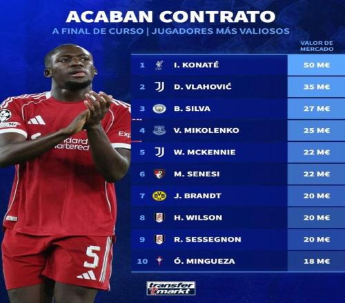 北京时间2月20日,德转列出了现有条约今年6月到期德转身价最高的10名球员,利物浦中卫科纳特以5000万欧元排名第一,尤文图斯先锋弗拉霍维奇3500万欧元第二,曼城队长伯纳多-席尔瓦2700万欧元第三 。