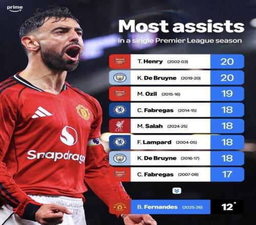 最近prime video sportuk整理了英超单赛季助攻纪录榜,亨利和德布劳内把数字顶在20次这条线上。眼下费尔南德斯本赛季已经送出12次助攻,按这份统计,曼联还剩14场联赛,他只差9次助攻就能把纪录改写。问题摆在这儿:就看曼联接下来的赛程强度和他最近这段送饼手感,费尔南德斯真能把亨利的20次助攻踩已往吗?