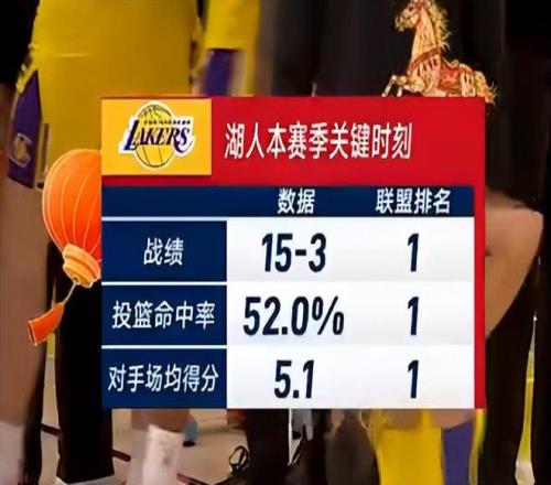 角逐竣事前转播方给出,湖人要害时刻15胜3负同盟第一,那么此役后湖人要害时刻就是16胜3负延续同盟第一,投篮掷中率、敌手场均得分也均为同盟第一。